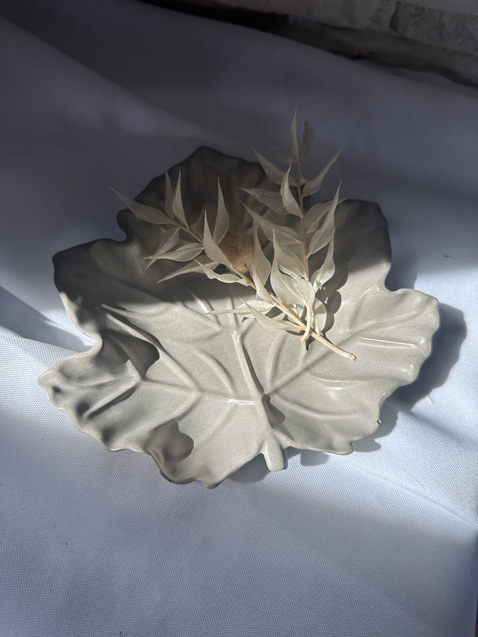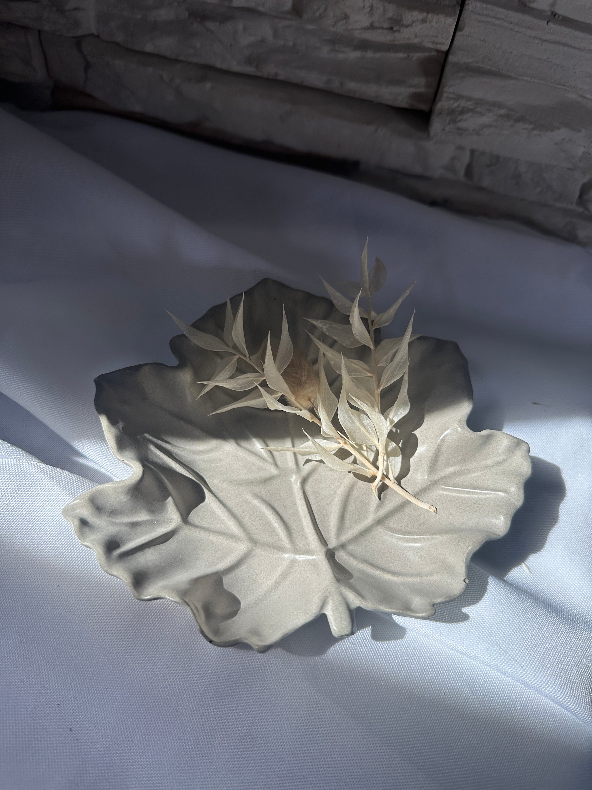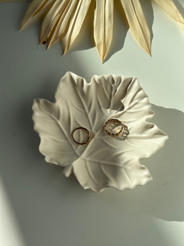 Diese exquisite Schmuckschale in Form eines Ahornblatts vereint natürliche Eleganz mit einem Hauch von Luxus. Aus hochwertiger Keramik oder Beton gefertigt, besticht die Schale durch ihre detaillierte Blattstruktur, die durch zarte, goldene Akzente noch verstärkt werden kann.