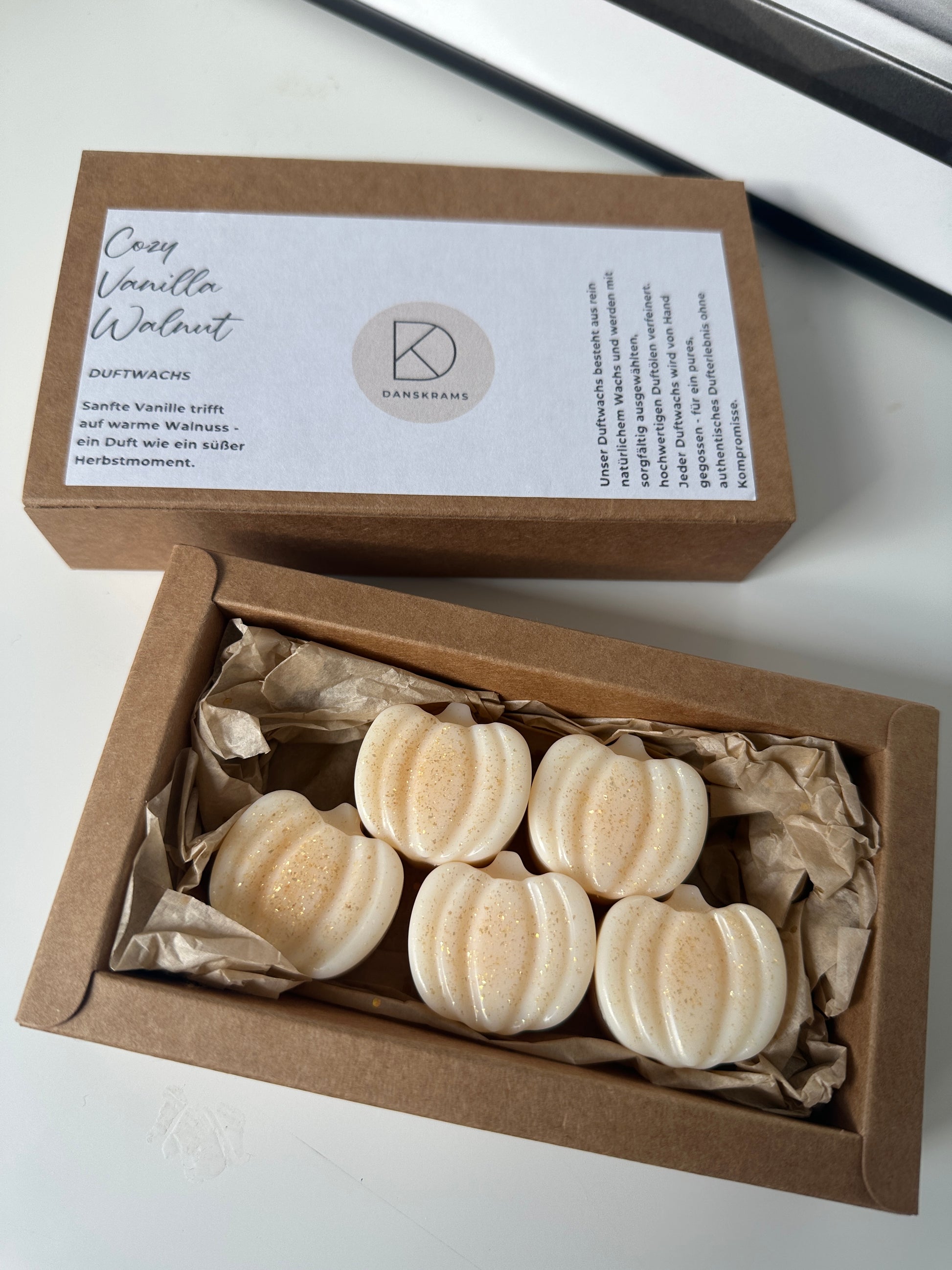 Diese liebevoll gestalteten Duftmelts in Kürbisform bringen herbstliche Gemütlichkeit in dein Zuhause. In der Duftöllampe geschmolzen, entfalten sie einen warmen, einladenden Duft aus cremiger Vanille und aromatischer Walnuss – süß, nussig und wohltuend.
