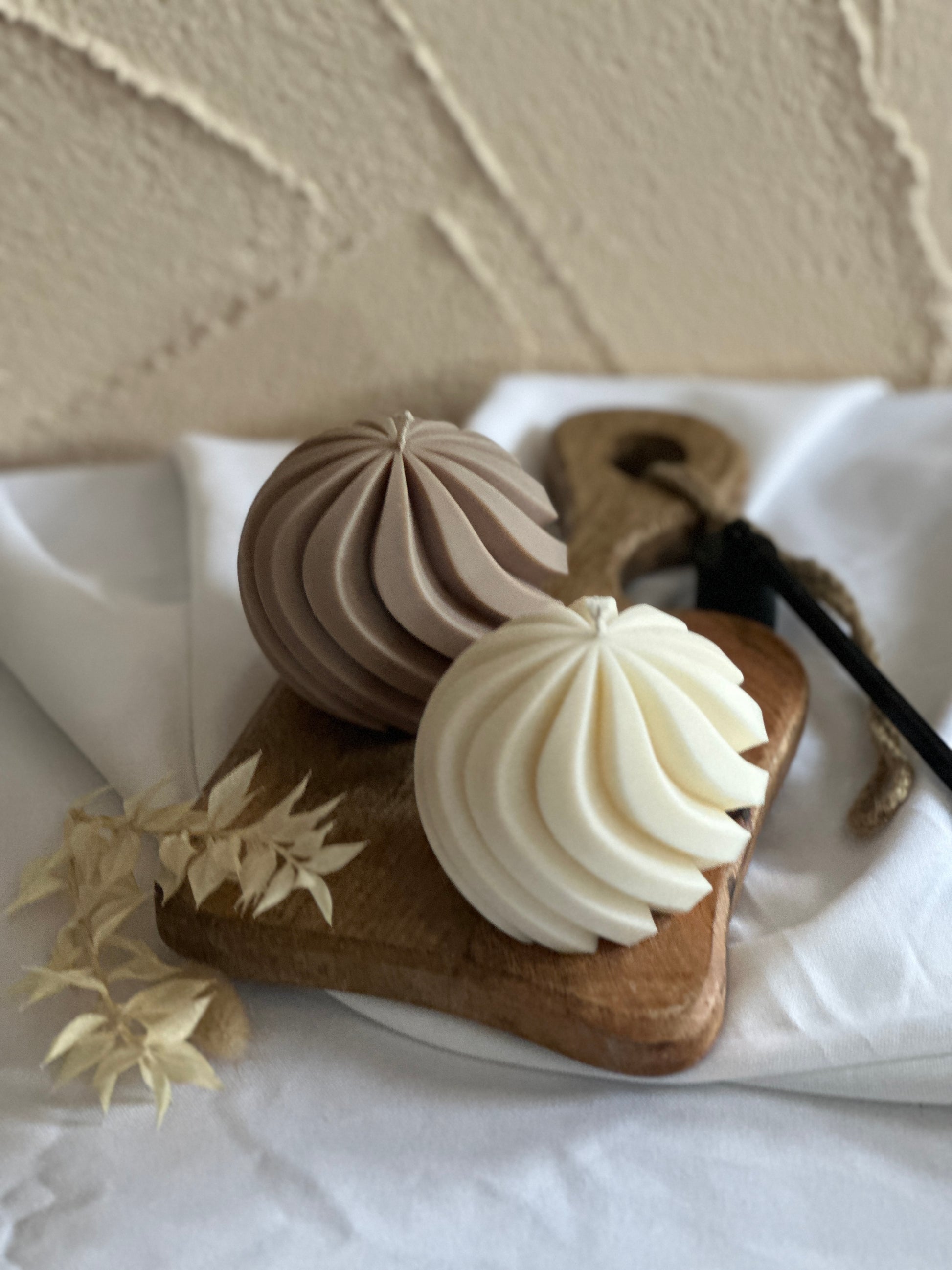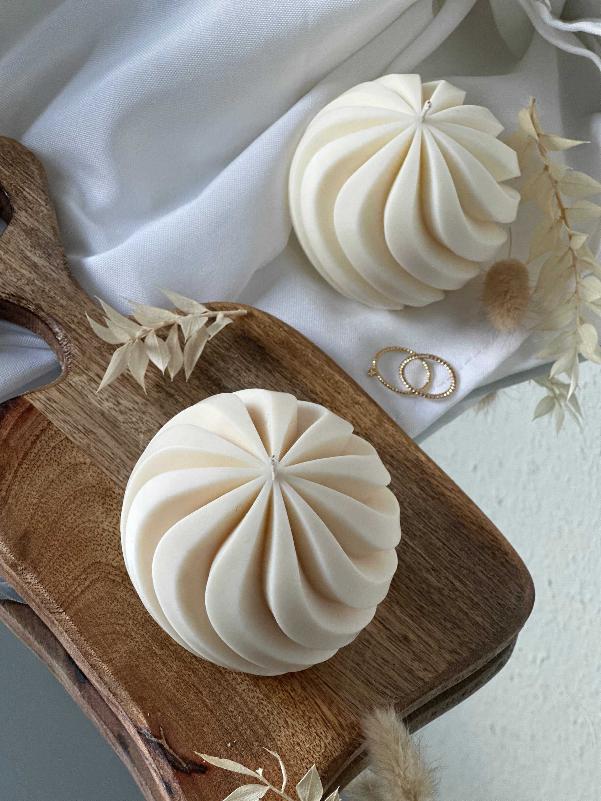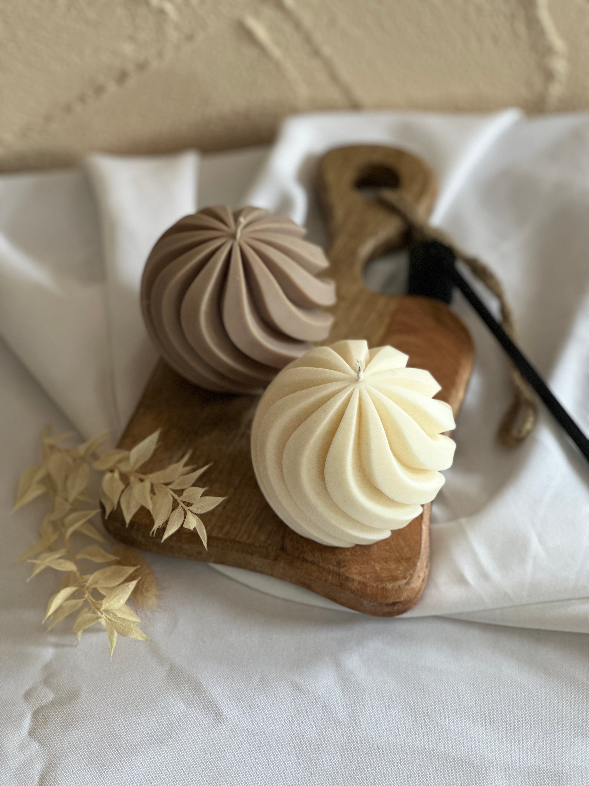 Diese handgefertigte Kerze besticht durch ihr einzigartiges geometrisches Design in Kugelform. Die Oberfläche ist mit einem markanten, spiralförmigen oder wellenartigen Muster versehen, das an sanfte Wellen oder einen eleganten Strudel erinnert. Dieses strukturierte Finish verleiht der Kerze eine moderne und gleichzeitig natürliche Ästhetik.